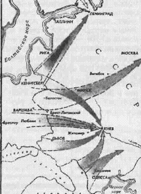 Почему это должно было совпасть с «Планом поражения » Тухачевского?! Почему ни Жуков, ни Тимошенко никак не реагировали на прямые предупреждения разведки о наиболее сильном ударе вермахта именно левым крылом, то есть на направлении именно тех округов, которые совместными усилиями должны были прикрывать Белорусское, особенно же Минское направление?! Почему с приходом Жукова на пост главы Генштаба гитлеровцы впали в категорическое убеждение, что «главные силы Красной Армии будут сконцентрированы в противоположном направлении от линии, дающей полную возможность для сильного удара»?! Кстати, вспомните и тот пример с выдержками из доклада югославского генштаба, о котором говорилось еще в п. I. Почему должна вырисовываться столь жесткая логическая связь? И почему как действия Жукова-Тимошенко, так и категорическое убеждение гитлеровцев так точно воспроизводили позицию Тухачевского из «Плана поражения»?! Ведь Жуков-Тимошенко концентрировали войска на нашем левом фланге, в Киевском округе (Юго-Западное направление), что для гитлеровцев и было не только правым флангом, а именно тем самым «противоположным направлением, от линии, дающей возможность для сильного удаpa»?! А вот возможность сильного удара они видели именно на Белорусском (Западном) направлении (во взаимодействии с ударом на Северо-Западном, то есть Прибалтийском направлении). Почему, на каком основании, но опять-таки в точном соответствии с этим же «Планом поражения» Тухачевского, Жуков и Тимошенко переакцентировали центр тяжести всех усилий на Юго-Западное направление?! Ведь вопреки всем их байкам, Сталин такого приказа им не давал. Нет ни малейшей, ни документальной, ни иной зацепки для того, чтобы приписывать ему такое. Первым, кто стал настаивать на переносе центра тяжести всех усилий на Юго-Западное направление, был сам нарком обороны, маршал С. К. Тимошенко. Причем он начал это делать ещё до того, как проект будущего официального плана обороны был доложен правительству. Далее его поддержал в этом вопросе непосредственно Жуков, ещё в бытность командующим КОВО. Почему даже послевоенные объяснения Жукова откровенно повторяли наущения Тухачевского из «Плана поражения», где он талдычил об особом приоритете Украинского направления для Гитлера?! Между тем, понимая, что центр тяжести трагедии в начале войны имел место на Белорусском направлении, но не зная, как за это оправдаться, после войны Жуков нагло оскорбил ГРУ беспардонно хамским упреком в том, что-де военная разведка, видите ли, чего-то не досмотрела в Польше?! А это как объяснить?! Тем же «“фантастическим” для планов Гитлера замыслом главного удара на Белорусском направлении», как пытался убедить еще Тухачевский?! Но почему в таком случае, когда ГРУ уже буквально кричало об угрозе нашим войскам именно с польского плацдарма, Жуков и Тимошенко нагло игнорировали любые разведданные на этот счёт?! ГРУ кричало об этом даже в тех документах, излагавшаяся информация в которых формально и не относилась к ситуации в Польше, с плацдарма которой и готовился главный удар — на Белорусском направлении! Поразительно, но факт, что Жуков письменно подтвердил, что ему достоверно было известно об особой концентрации германских войск на польском плацдарме [Речь идёт о «гениальном плане» от 15 мая 1941 г., из преамбулы которого и пр