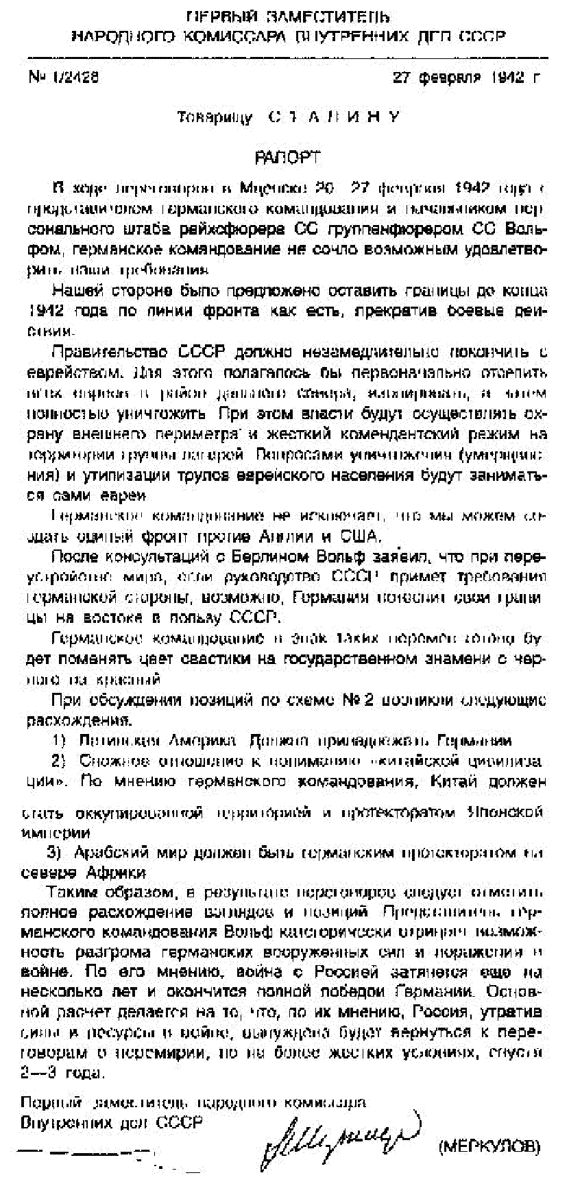 | Миф № 49 Сразу же после Московского контрнаступления Верховный Главнокомандующий Сталин вступил в тайные переговоры с Третьим рейхом об установлении сепаратного мира и борьбе с мировым еврейством |