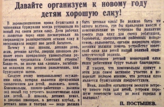 | 28 декабря 1935 год Новый год – праздник, который подарил нам Сталин! 28 декабря 1935 года в газете «Правда» вышла статья второго секретаря ЦК КП Украины П.П. Постышева: «Давайте организуем к Новому году детям хорошую елку!». Это был очень важный и своевременный шаг, так как празднование Нового года и Рождества Христова было отменено еще в двадцатых годах, дни недели именовались по числам, а вся страна трудилась над успешным выполнением пятилетнего плана. И вдруг Новый год, нарядная елка, игрушки и подарки, предпраздничная суета, хотя сам праздник еще не был выходным днем, но улыбки на лицах ребят и взрослых были лучшим свидетельством того, что это торжество необходимо. Уже на следующий, 1936 год, встреча Нового года распространилась на всю страну, появились елочные базары, стали изготавливаться артелями елочные украшения, дарились подарки. На новогодней елке 1937 года в Доме Советов в Москве впервые появилась Снегурочка – внучка Деда Мороза. Именно с этого момента стало известно изречение И.В. Сталина: «Жить стало лучше, жить стало веселей!». ![]() |
